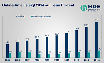 ![]() | 1. Das Internet ist wichtig und wird weiter wachsen. Nach einer aktuellen Studie des HDE zeigt sich, dass die Umsätze im E-Commerce seit 2005 stetig wachsen. So lag der Umsatz 2013 bei 33,1 Milliarden Euro, was eine Steigerung von 12 Prozent im Vergleich zum Vorjahr bedeutete. |
