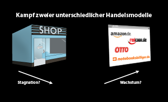 ![]() | 2. Kampf zweier unterschiedlicher Handelsmodelle Der Status Quo ist, dass mit dem stationären Handel und dem Online-Handel zwei konkurrierende Handelsmodelle existieren. Jedes Modell hat spezifische Vor- und Nachteile. |
