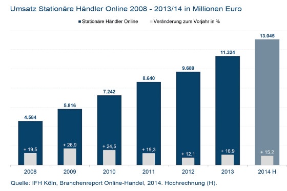 Aktuelle Marktzahlen des IFH Köln zeigen, dass stationäre Händler mit angeschlossenen Online-Shops den reinen Onlinehändlern Umsatzanteile abnehmen. Im Jahr 2014 wurden über diesen Vertriebsweg rund 13 Milliarden Euro umgesetzt, das entspricht einem Plus von 15 Prozent im Vergleich zum Vorjahr. Damit gaben die deutschen Online-Shopper fast jeden dritten Euro in den Online-Shops ursprünglich stationärer Händler aus.